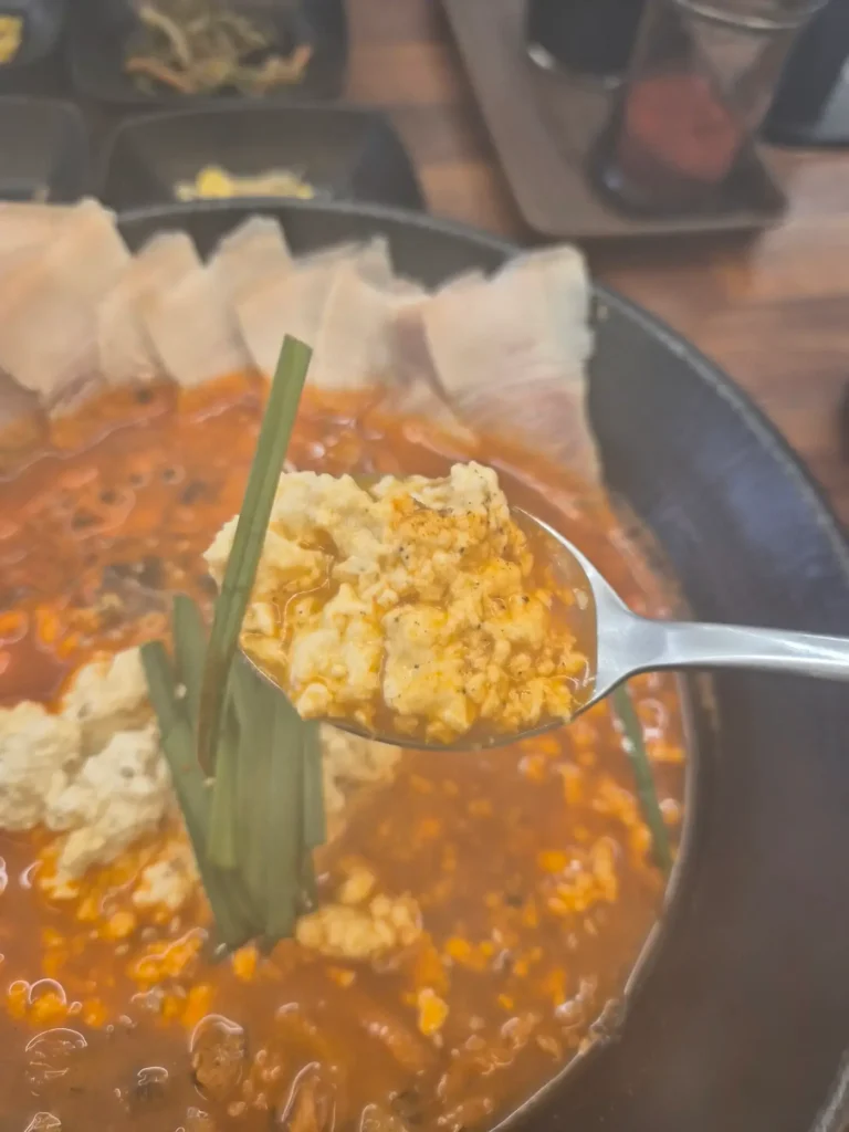 1. Taste the Tofu First: Before mixing, scoop up just the white tofu and soup. Enjoy the contrast between the spicy red broth and the mild white tofu.