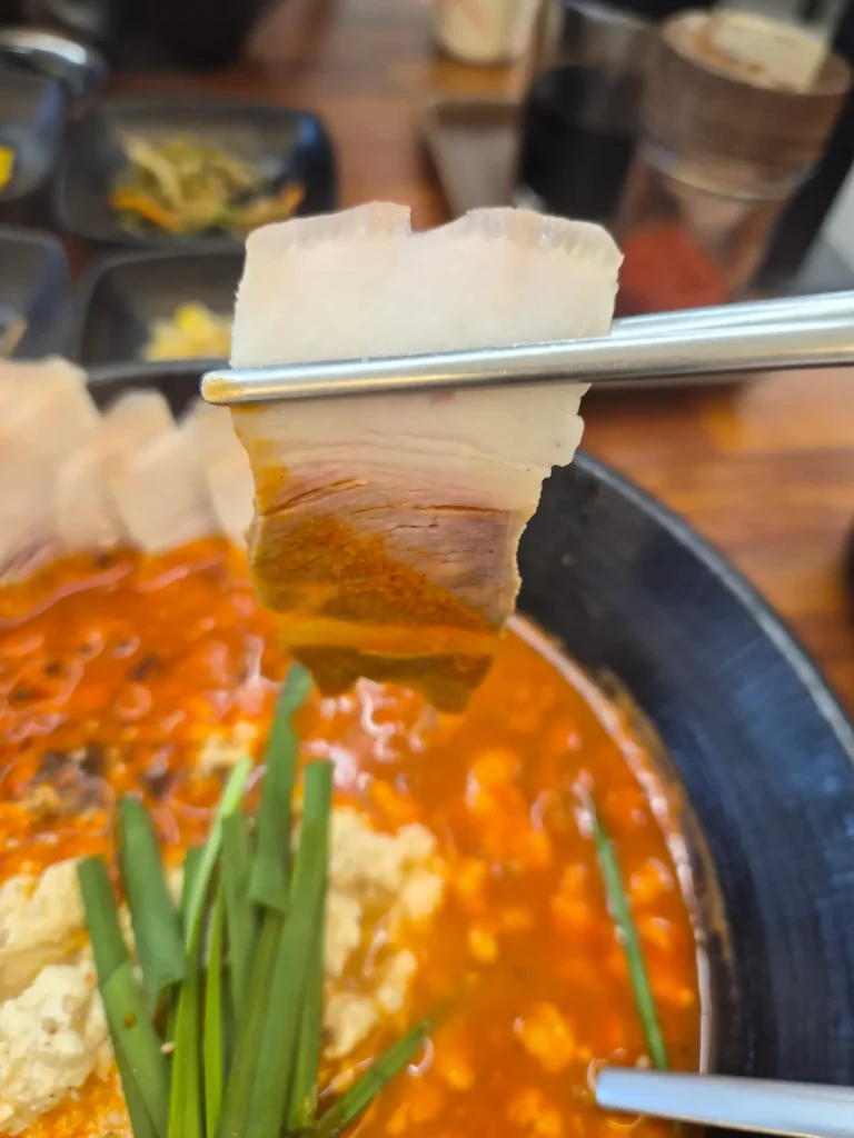 While the standard bowl is famous, the real pro move here is ordering the Suyuk Jjamppong Sundubu (Boiled Pork + Tofu). It turns a simple soup into a rich, hearty feast that locals love.